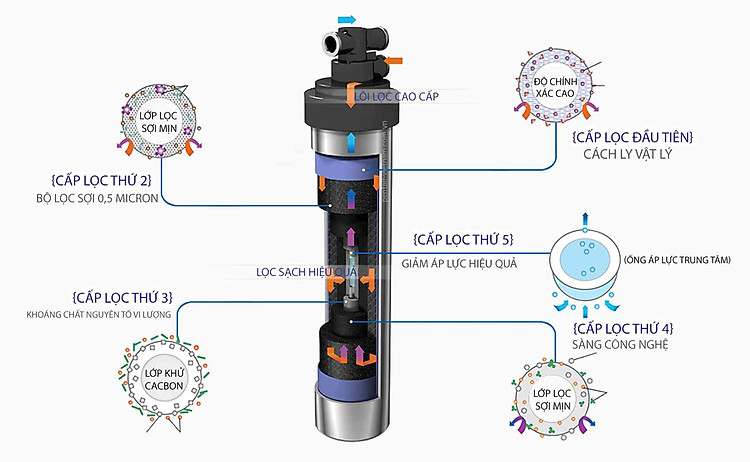 | Tính năng | • Loại bỏ dư lượng chì xuống dưới mức cho phép là 15 ppb • Loại bỏ vi khuẩn • Chlorine và các chất gây mùi, vị khó chịu trong nước • Chất bẩn và cặn đục • Mốc, Tảo độc • Ôxít Sắt • Ôxít Mangan • Ôxít Sunfua • Loại bỏ các tạp cất có kích thức từ 0.5 micron trở lên • Giảm đóng cặn trong thiết bị đun sôi nước • Lọc hiệu quả hơn hẳn so với các lọc thông thường khác |