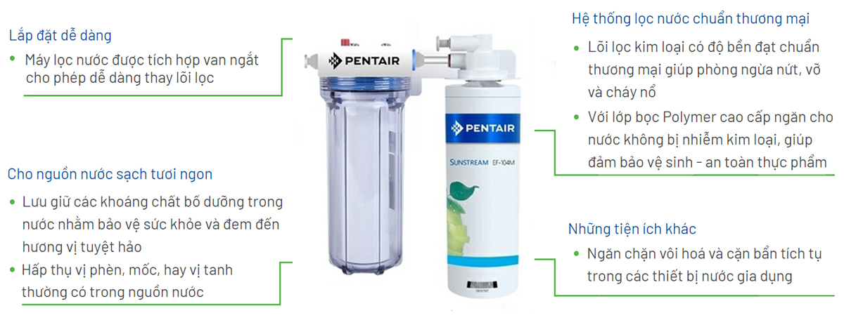 Máy Lọc Nước Uống Trực Tiếp Pentair EF 104M USA là sự kết hợp hoàn hảo. Không chỉ loại bỏ các chất có hại trong nước như: Các tạp chất, hóa chất, clo, trầm tích, virus, vi khuẩn, mà còn loại bỏ được 99,9% kim loại nặng bị nhiễm trong nước như: Asen (As), Thủy ngân (Hg), Crom (Cr), Niken (Ni), Đồng (Cu), Chì (Pb),ơn nữa còn giữ được các chất khoáng tự nhiên (Natri, Kali, Canxi, Magie, Sắt, Kẽm,) có lợi cho sức khỏe.